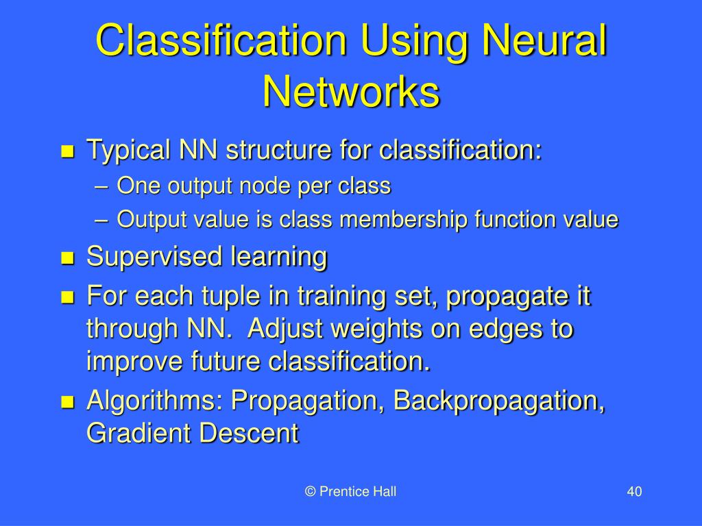 Classification Using Neural Networks • Typical NN structure for classification: • One output node per class • Output value is class membership function value • Supervised learning • For each tuple in training set, propagate it through NN. Adjust weights on edges to improve future classification. • Algorithms: Propagation, Backpropagation, Gradient Descent © Prentice Hall