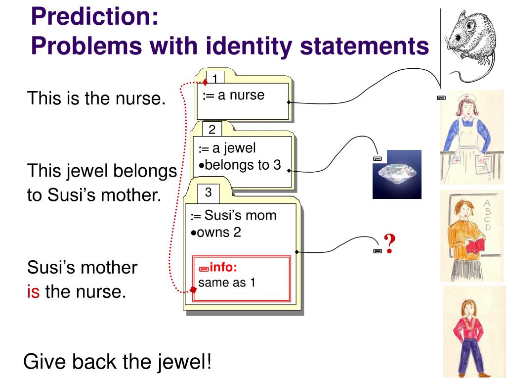 1 a nurse 2 a jewel belongs to 3 ? Attributive interpretation Pitfalls uncovered by file cards:Attributive “is” This is the nurse. This jewel belongs to Susi’s mother. Susi’s mother is the nurse. 3 Susi’s mom owns 2 is a nurse Give back the jewel! Susi’s mom Nurse Discourse – External Referents ESF- Metacognition