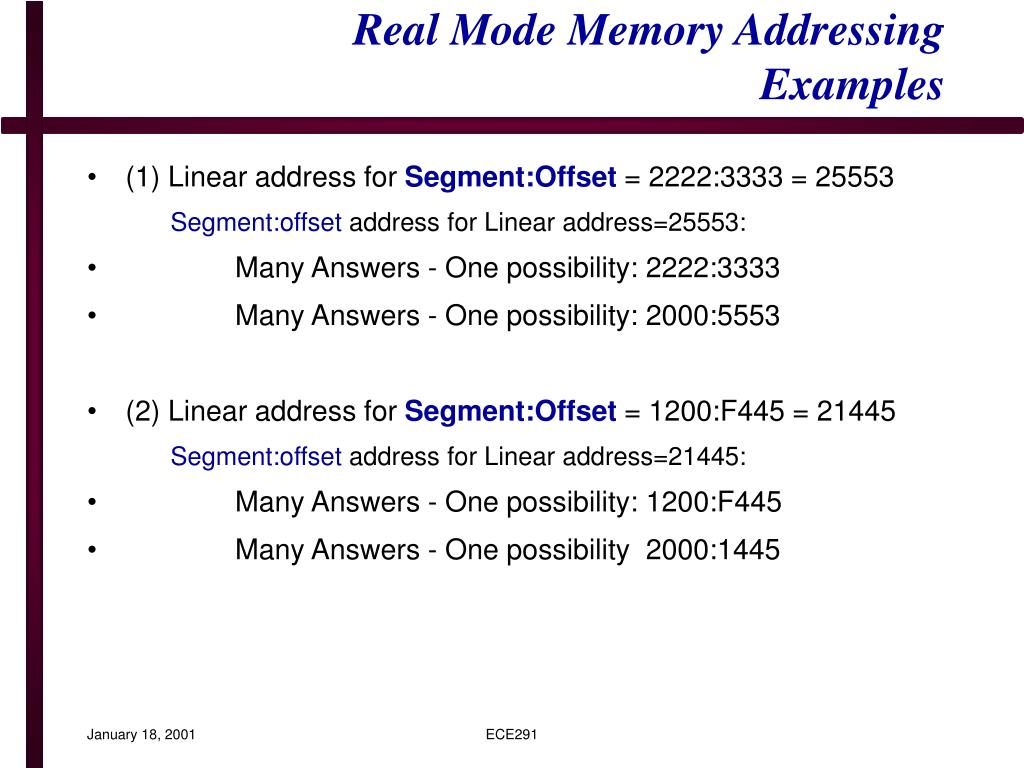 Real Mode Memory Addressing Examples • (1) Linear address for Segment:Offset = 2222:3333 = 25553 Segment:offset address for Linear address=25553: • Many Answers - One possibility: 2222:3333 • Many Answers - One possibility: 2000:5553 • (2) Linear address for Segment:Offset = 1200:F445 = 21445 Segment:offset address for Linear address=21445: • Many Answers - One possibility: 1200:F445 • Many Answers - One possibility 2000:1445 ECE291