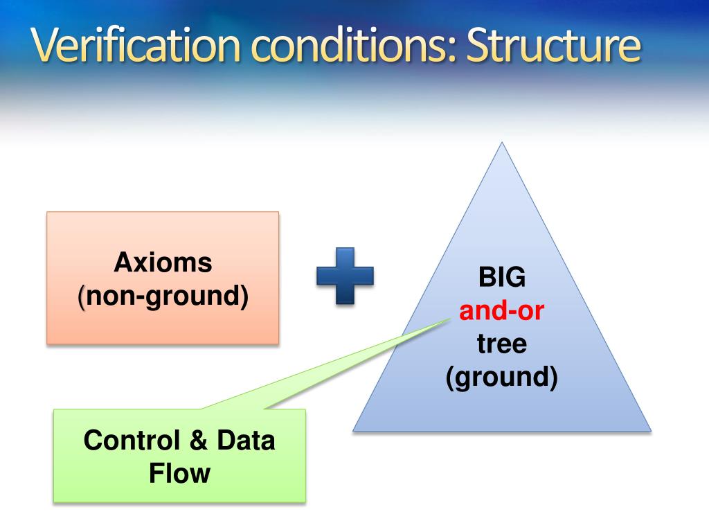 Verification conditions: Structure BIG and-or tree (ground) Axioms • (non-ground) Control & Data Flow