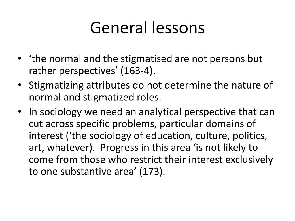General lessons • ‘the normal and the stigmatised are not persons but rather perspectives’ (163-4). • Stigmatizing attributes do not determine the nature of normal and stigmatized roles. • In sociology we need an analytical perspective that can cut across specific problems, particular domains of interest (‘the sociology of education, culture, politics, art, whatever). Progress in this area ‘is not likely to come from those who restrict their interest exclusively to one substantive area’ (173).