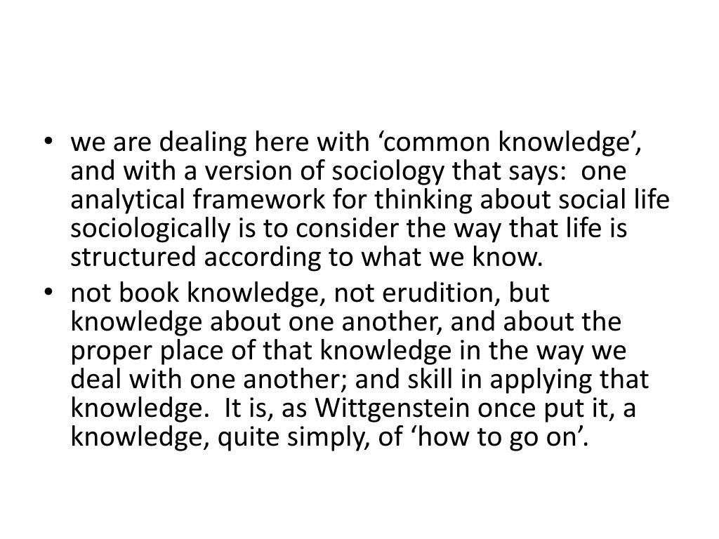 we are dealing here with ‘common knowledge’, and with a version of sociology that says: one analytical framework for thinking about social life sociologically is to consider the way that life is structured according to what we know. • not book knowledge, not erudition, but knowledge about one another, and about the proper place of that knowledge in the way we deal with one another; and skill in applying that knowledge. It is, as Wittgenstein once put it, a knowledge, quite simply, of ‘how to go on’.
