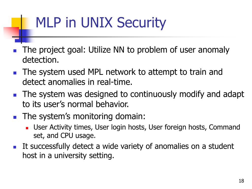 MLP in UNIX Security • The project goal: Utilize NN to problem of user anomaly detection. • The system used MPL network to attempt to train and detect anomalies in real-time. • The system was designed to continuously modify and adapt to its user’s normal behavior. • The system’s monitoring domain: • User Activity times, User login hosts, User foreign hosts, Command set, and CPU usage. • It successfully detect a wide variety of anomalies on a student host in a university setting.