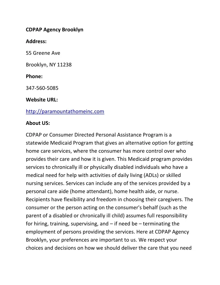 CDPAP Agency Brooklyn Address: 55 Greene Ave Brooklyn, NY 11238 Phone: 347-560-5085 Website URL: http://paramountathomeinc.com About US: CDPAP or Consumer Directed Personal Assistance Program is a statewide Medicaid Program that gives an alternative option for getting home care services, where the consumer has more control over who provides their care and how it is given. This Medicaid program provides services to chronically ill or physically disabled individuals who have a medical need for help with activities of daily living (ADLs) or skilled nursing services. Services can include any of the services provided by a personal care aide (home attendant), home health aide, or nurse. Recipients have flexibility and freedom in choosing their caregivers. The consumer or the person acting on the consumer's behalf (such as the parent of a disabled or chronically ill child) assumes full responsibility for hiring, training, supervising, and – if need be – terminating the employment of persons providing the services. Here at CDPAP Agency Brooklyn, your preferences are important to us. We respect your choices and decisions on how we should deliver the care that you need