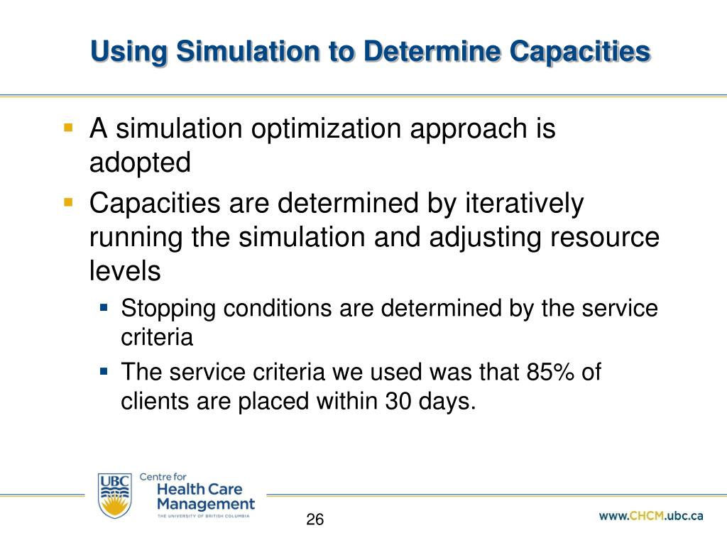 Using Simulation to Determine Capacities • A simulation optimization approach is adopted • Capacities are determined by iteratively running the simulation and adjusting resource levels • Stopping conditions are determined by the service criteria • The service criteria we used was that 85% of clients are placed within 30 days.