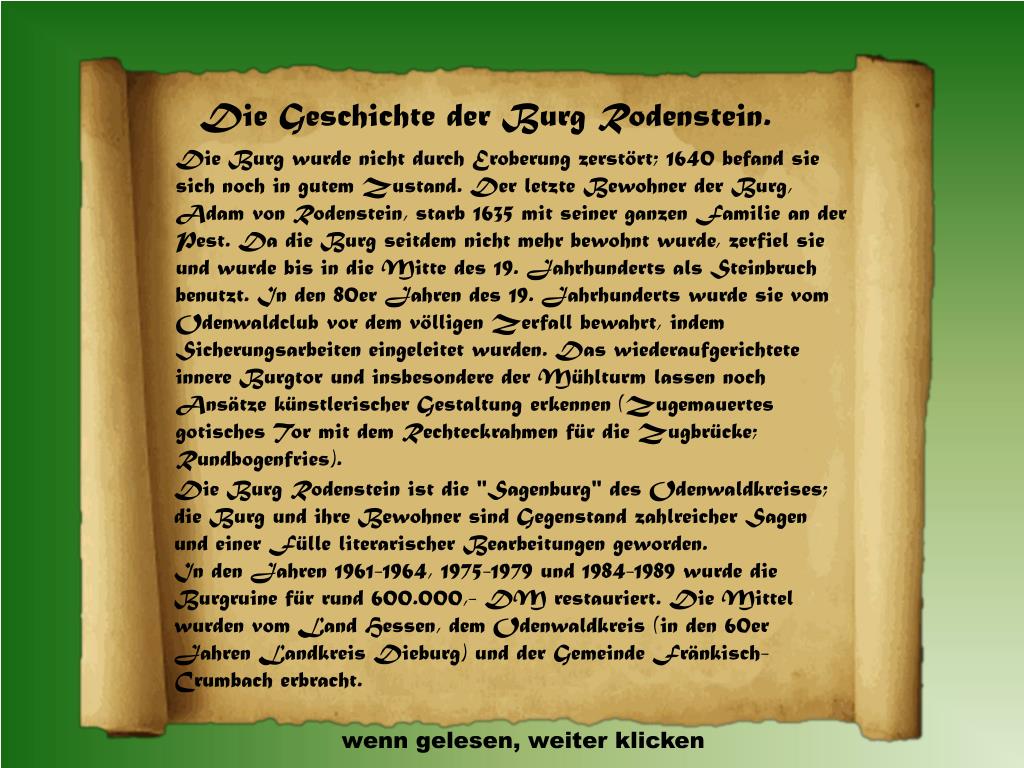 Die Geschichte der Burg Rodenstein. Die Burg wurde nicht durch Eroberung zerstört; 1640 befand sie sich noch in gutem Zustand. Der letzte Bewohner der Burg, Adam von Rodenstein, starb 1635 mit seiner ganzen Familie an der Pest. Da die Burg seitdem nicht mehr bewohnt wurde, zerfiel sie und wurde bis in die Mitte des 19. Jahrhunderts als Steinbruch benutzt. In den 80er Jahren des 19. Jahrhunderts wurde sie vom Odenwaldclub vor dem völligen Zerfall bewahrt, indem Sicherungsarbeiten eingeleitet wurden. Das wiederaufgerichtete innere Burgtor und insbesondere der Mühlturm lassen noch Ansätze künstlerischer Gestaltung erkennen (Zugemauertes gotisches Tor mit dem Rechteckrahmen für die Zugbrücke; Rundbogenfries). Die Burg Rodenstein ist die "Sagenburg" des Odenwaldkreises; die Burg und ihre Bewohner sind Gegenstand zahlreicher Sagen und einer Fülle literarischer Bearbeitungen geworden.In den Jahren 1961-1964, 1975-1979 und 1984-1989 wurde die Burgruine für rund 600.000,- DM restauriert. Die Mittel wurden vom Land Hessen, dem Odenwaldkreis (in den 60er Jahren Landkreis Dieburg) und der Gemeinde Fränkisch-Crumbach erbracht. wenn gelesen, weiter klicken