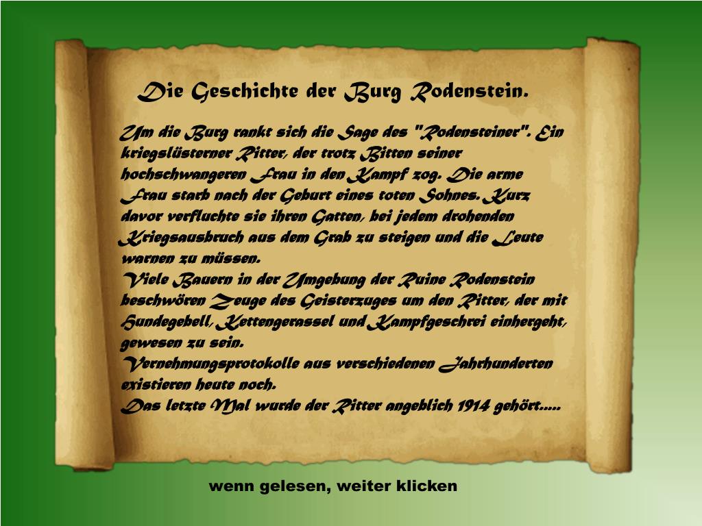 Die Geschichte der Burg Rodenstein. Um die Burg rankt sich die Sage des "Rodensteiner". Ein kriegslüsterner Ritter, der trotz Bitten seiner hochschwangeren Frau in den Kampf zog. Die arme Frau starb nach der Geburt eines toten Sohnes. Kurz davor verfluchte sie ihren Gatten, bei jedem drohenden Kriegsausbruch aus dem Grab zu steigen und die Leute warnen zu müssen. Viele Bauern in der Umgebung der Ruine Rodenstein beschwören Zeuge des Geisterzuges um den Ritter, der mit Hundegebell, Kettengerassel und Kampfgeschrei einhergeht, gewesen zu sein. Vernehmungsprotokolle aus verschiedenen Jahrhunderten existieren heute noch. Das letzte Mal wurde der Ritter angeblich 1914 gehört..... wenn gelesen, weiter klicken