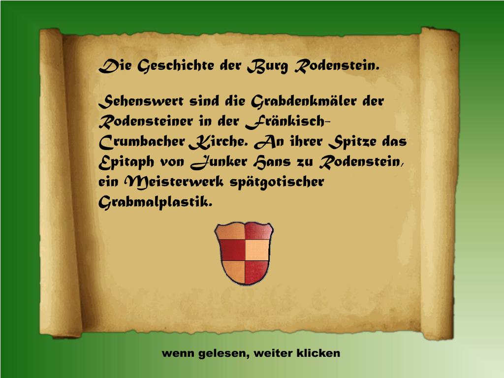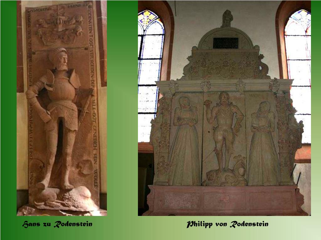 Die Geschichte der Burg Rodenstein. Sehenswert sind die Grabdenkmäler der Rodensteiner in der Fränkisch-Crumbacher Kirche. An ihrer Spitze das Epitaph von Junker Hans zu Rodenstein, ein Meisterwerk spätgotischer Grabmalplastik. wenn gelesen, weiter klicken