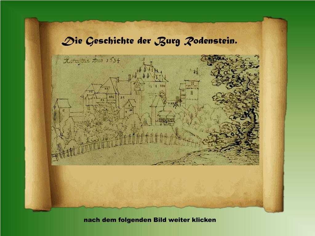 Die Geschichte der Burg Rodenstein. Die Burg wurde um 1240 von den Brüdern Rudolf und Friedrich von Crumbach, die sich seit 1256 "von Rodenstein" nannten, erbaut.Sie stellte - nach einer Skizze Valentin Wagners aus dem Jahre 1634 - eine schlossartige Anlage dar, deren Gebäude dicht aneinander grenzten. Die Gebäude waren mit meist abgewalmten Dächern und mit vorgekragten Fachwerkerkern versehen. Die Burg gehörte zum Typus der Schild- und Mantelmauerburg; sie war gegen die Angriffsseite durch eine Schildmauer verstärkt, der Kernbau wurde von einer Mantelmauer umgeben. Außerdem war die Südseite durch einen Vorzwinger und durch ein halbrundes Geschützrondell befestigt. nach dem folgenden Bild weiter klicken