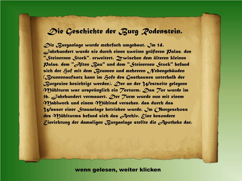 Die Geschichte der Burg Rodenstein. Die Burganlage wurde mehrfach umgebaut. Im 14. Jahrhundert wurde sie durch einen zweiten größeren Palas, den "Steinernen Stock", erweitert. Zwischen dem älteren kleinen Palas, dem "Alten Bau" und dem "Steinernen Stock" befand sich der Hof mit dem Brunnen und mehreren Nebengebäuden (Brunnenaufsatz kann im Hofe des Gasthauses unterhalb der Burgruine besichtigt werden). Der an der Westseite gelegene Mühlturm war ursprünglich ein Torturm. Das Tor wurde im 16. Jahrhundert vermauert. Der Turm wurde nun mit einem Mahlwerk und einem Mühlrad versehen, das durch das Wasser einer Stauanlage betrieben wurde. Im Obergeschoss des Mühlturms befand sich das Archiv. Eine besondere Einrichtung der damaligen Burganlage stellte die Apotheke dar. wenn gelesen, weiter klicken