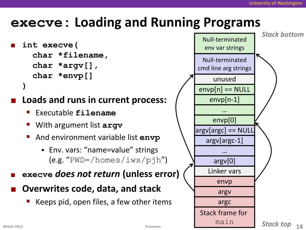 execve:Loading and Running Programs Stack bottom Null-terminated envvar strings • intexecve( char *filename, char *argv[], char *envp[]) • Loads and runs in current process: • Executable filename • With argument list argv • And environment variable listenvp • Env. vars: “name=value” strings(e.g. “PWD=/homes/iws/pjh”) • execve does not return (unless error) • Overwrites code, data, and stack • Keeps pid, open files, a few other items Null-terminated cmd line arg strings unused envp[n] == NULL envp[n-1] … envp[0] argv[argc] == NULL argv[argc-1] … argv[0] Linker vars envp argv argc Stack frame for main Stack top Processes