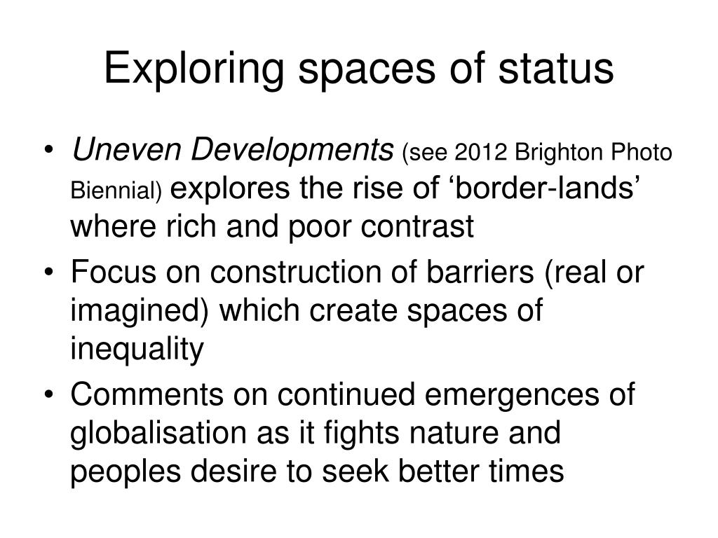 Exploring spaces of status • Uneven Developments (see 2012 Brighton Photo Biennial) explores the rise of ‘border-lands’ where rich and poor contrast • Focus on construction of barriers (real or imagined) which create spaces of inequality • Comments on continued emergences of globalisation as it fights nature and peoples desire to seek better times