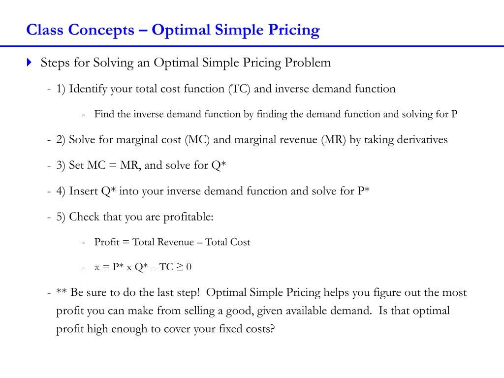 Class Concepts – Optimal Simple Pricing • Steps for Solving an Optimal Simple Pricing Problem • 1) Identify your total cost function (TC) and inverse demand function • Find the inverse demand function by finding the demand function and solving for P • 2) Solve for marginal cost (MC) and marginal revenue (MR) by taking derivatives • 3) Set MC = MR, and solve for Q* • 4) Insert Q* into your inverse demand function and solve for P* • 5) Check that you are profitable: • Profit = Total Revenue – Total Cost • π = P* x Q* – TC ≥ 0 • ** Be sure to do the last step! Optimal Simple Pricing helps you figure out the most profit you can make from selling a good, given available demand. Is that optimal profit high enough to cover your fixed costs?