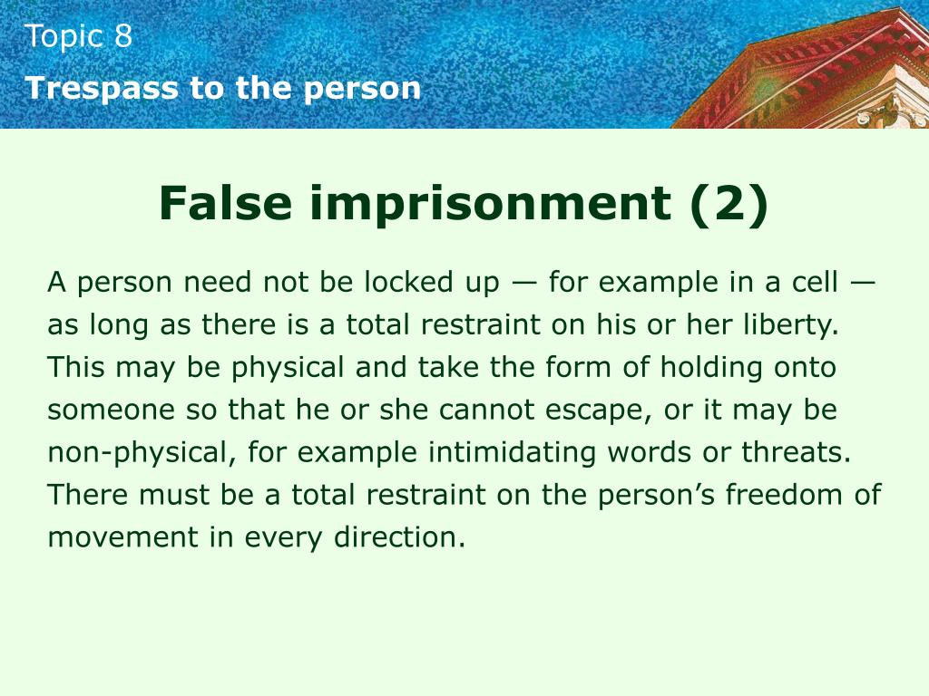 Trespass to the person False imprisonment (2) A person need not be locked up — for example in a cell — as long as there is a total restraint on his or her liberty. This may be physical and take the form of holding onto someone so that he or she cannot escape, or it may be non-physical, for example intimidating words or threats. There must be a total restraint on the person’s freedom of movement in every direction.