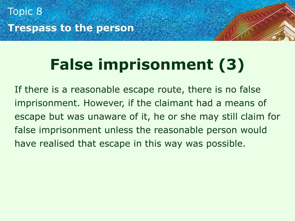 Trespass to the person False imprisonment (3) If there is a reasonable escape route, there is no false imprisonment. However, if the claimant had a means of escape but was unaware of it, he or she may still claim for false imprisonment unless the reasonable person would have realised that escape in this way was possible.