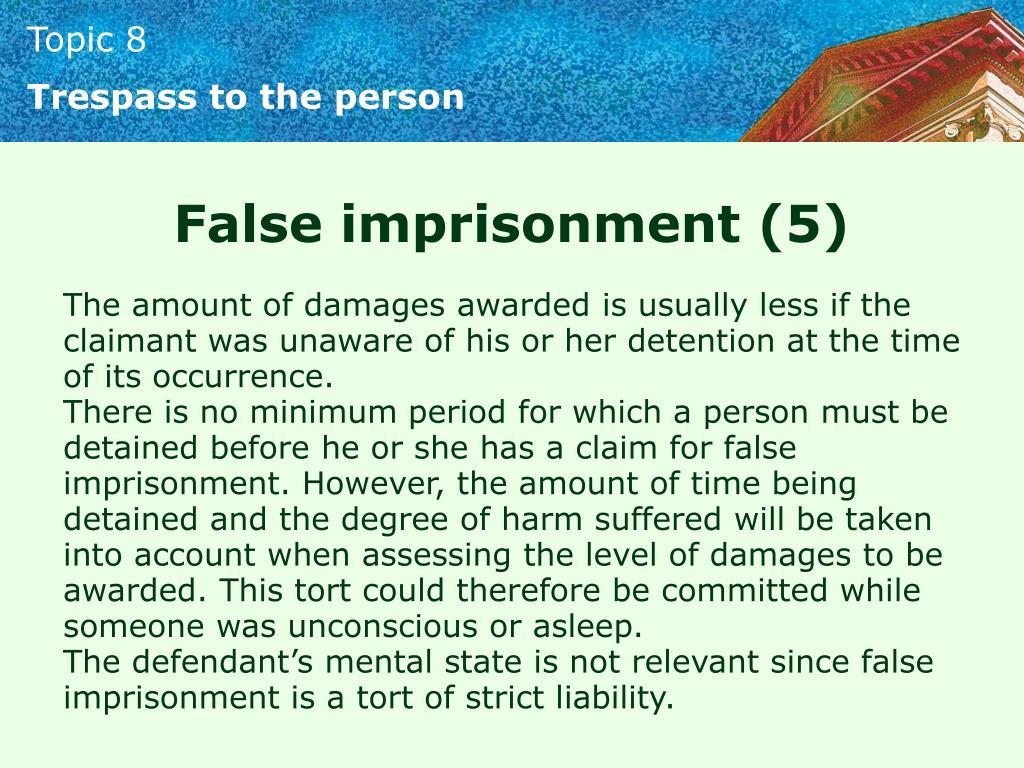 Trespass to the person False imprisonment (5) The amount of damages awarded is usually less if the claimant was unaware of his or her detention at the time of its occurrence. There is no minimum period for which a person must be detained before he or she has a claim for false imprisonment. However, the amount of time being detained and the degree of harm suffered will be taken into account when assessing the level of damages to be awarded. This tort could therefore be committed while someone was unconscious or asleep. The defendant’s mental state is not relevant since false imprisonment is a tort of strict liability.