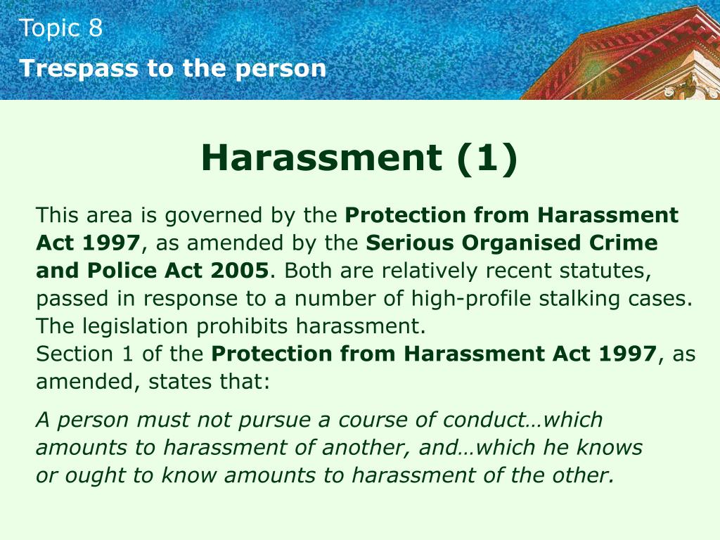 Trespass to the person Harassment (1) This area is governed by the Protection from Harassment Act 1997, as amended by the Serious Organised Crime and Police Act 2005. Both are relatively recent statutes, passed in response to a number of high-profile stalking cases. The legislation prohibits harassment. Section 1 of the Protection from Harassment Act 1997, as amended, states that: A person must not pursue a course of conduct…which amounts to harassment of another, and…which he knows or ought to know amounts to harassment of the other.