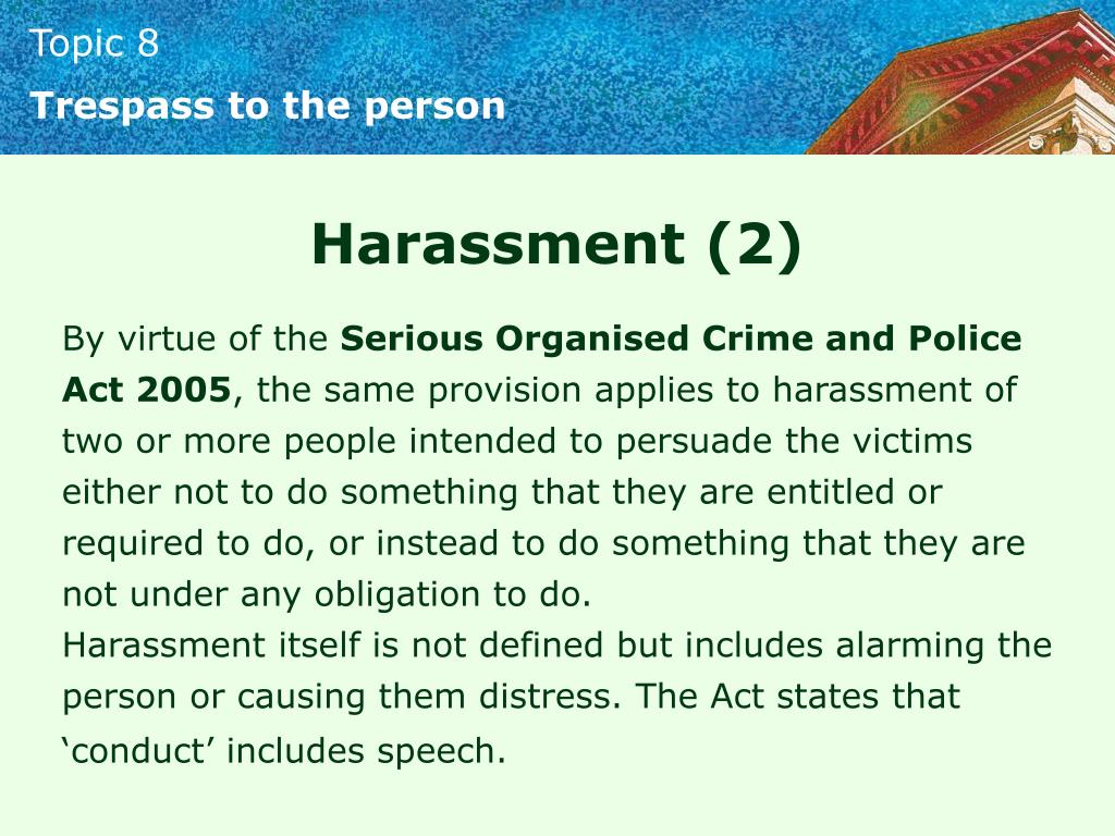 Trespass to the person Harassment (2) By virtue of the Serious Organised Crime and Police Act 2005, the same provision applies to harassment of two or more people intended to persuade the victims either not to do something that they are entitled or required to do, or instead to do something that they are not under any obligation to do. Harassment itself is not defined but includes alarming the person or causing them distress. The Act states that ‘conduct’ includes speech.