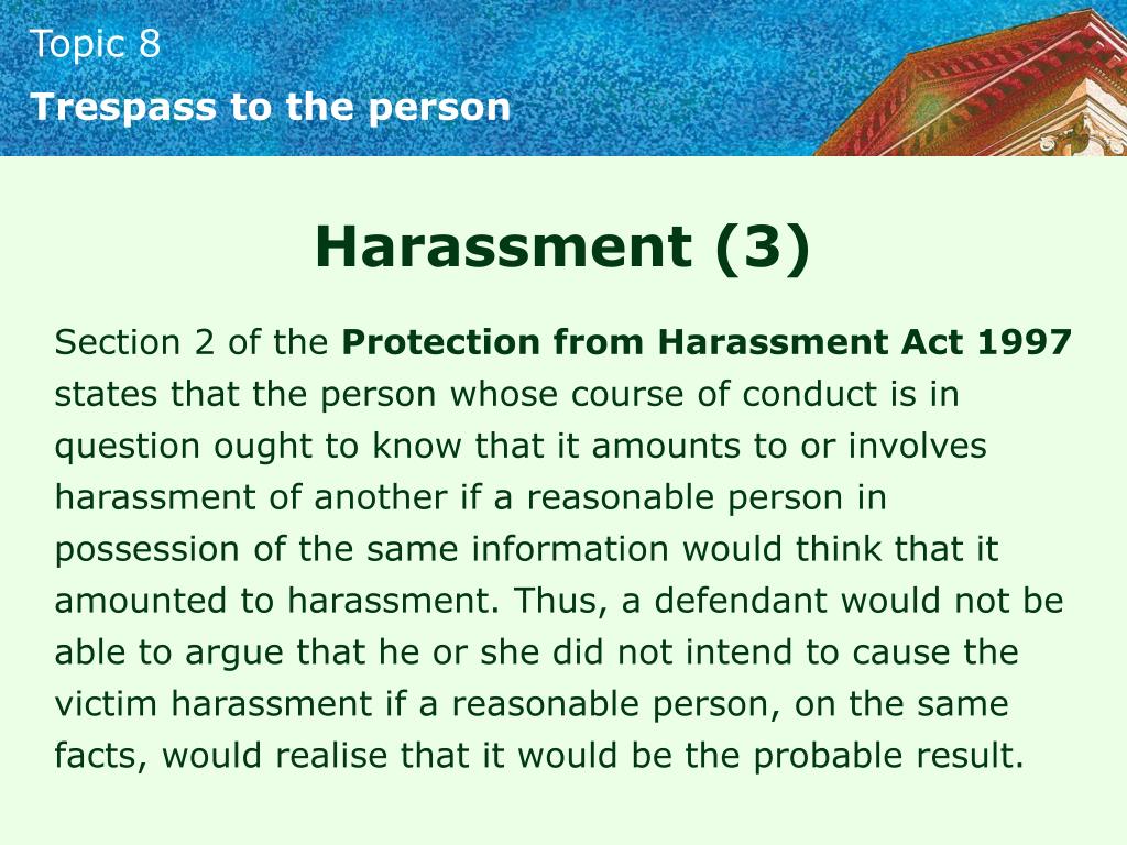 Trespass to the person Harassment (3) Section 2 of the Protection from Harassment Act 1997 states that the person whose course of conduct is in question ought to know that it amounts to or involves harassment of another if a reasonable person in possession of the same information would think that it amounted to harassment. Thus, a defendant would not be able to argue that he or she did not intend to cause the victim harassment if a reasonable person, on the same facts, would realise that it would be the probable result.
