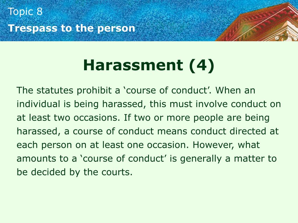 Trespass to the person Harassment (4) The statutes prohibit a ‘course of conduct’. When an individual is being harassed, this must involve conduct on at least two occasions. If two or more people are being harassed, a course of conduct means conduct directed at each person on at least one occasion. However, what amounts to a ‘course of conduct’ is generally a matter to be decided by the courts.