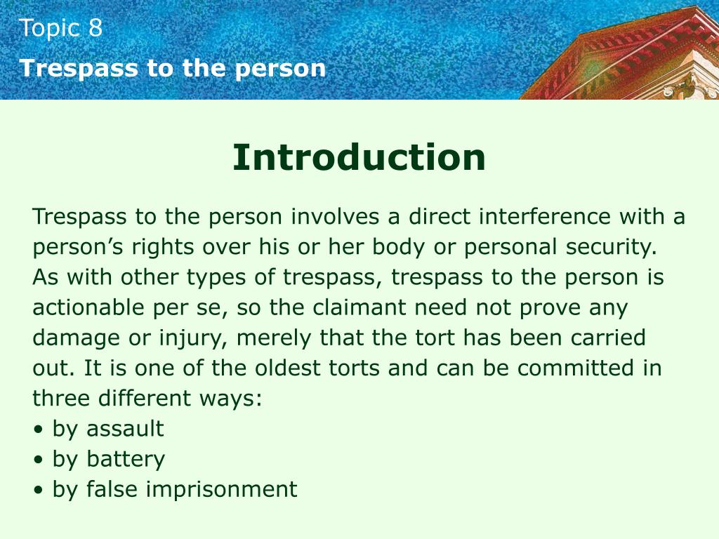 Trespass to the person Introduction • Trespass to the person involves a direct interference with a person’s rights over his or her body or personal security. As with other types of trespass, trespass to the person is actionable per se, so the claimant need not prove any damage or injury, merely that the tort has been carried out. It is one of the oldest torts and can be committed in three different ways: • by assault • by battery • by false imprisonment