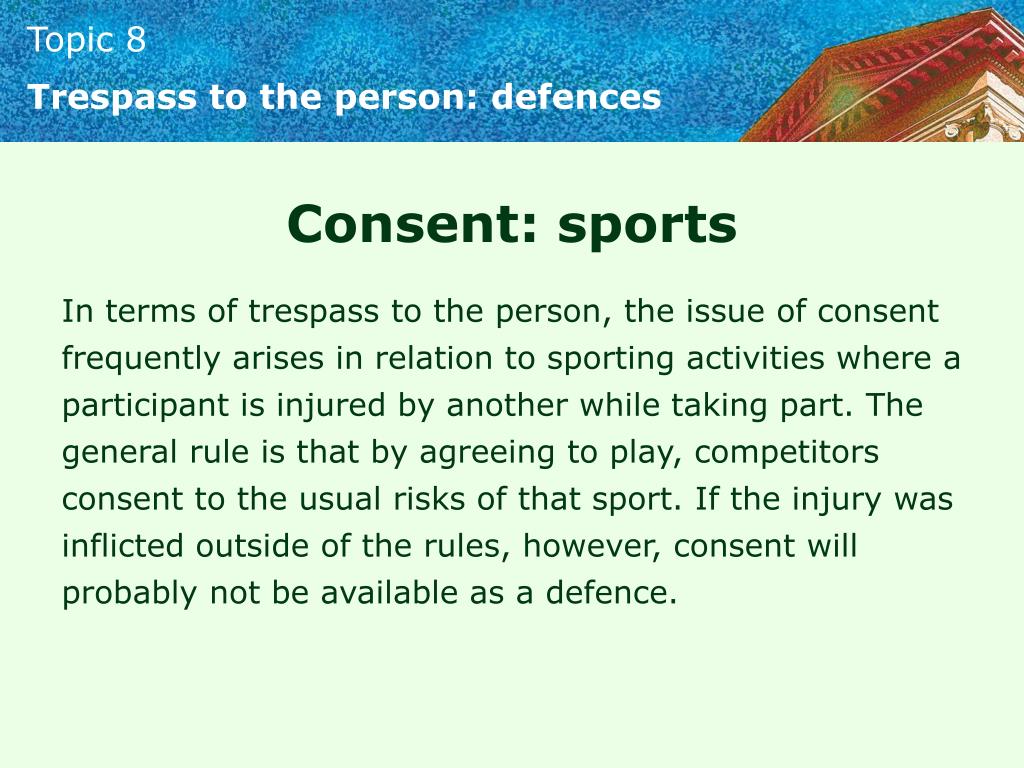 Trespass to the person: defences Consent: sports In terms of trespass to the person, the issue of consent frequently arises in relation to sporting activities where a participant is injured by another while taking part. The general rule is that by agreeing to play, competitors consent to the usual risks of that sport. If the injury was inflicted outside of the rules, however, consent will probably not be available as a defence.