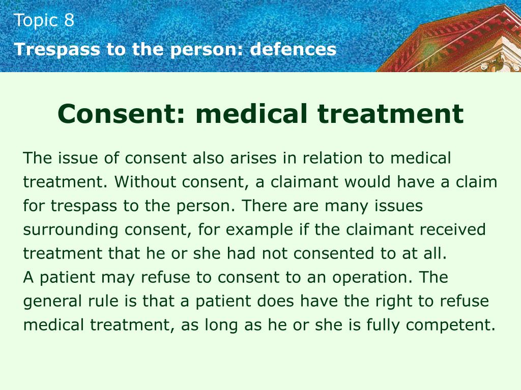 Trespass to the person: defences Consent: medical treatment The issue of consent also arises in relation to medical treatment. Without consent, a claimant would have a claim for trespass to the person. There are many issues surrounding consent, for example if the claimant received treatment that he or she had not consented to at all. A patient may refuse to consent to an operation. The general rule is that a patient does have the right to refuse medical treatment, as long as he or she is fully competent.