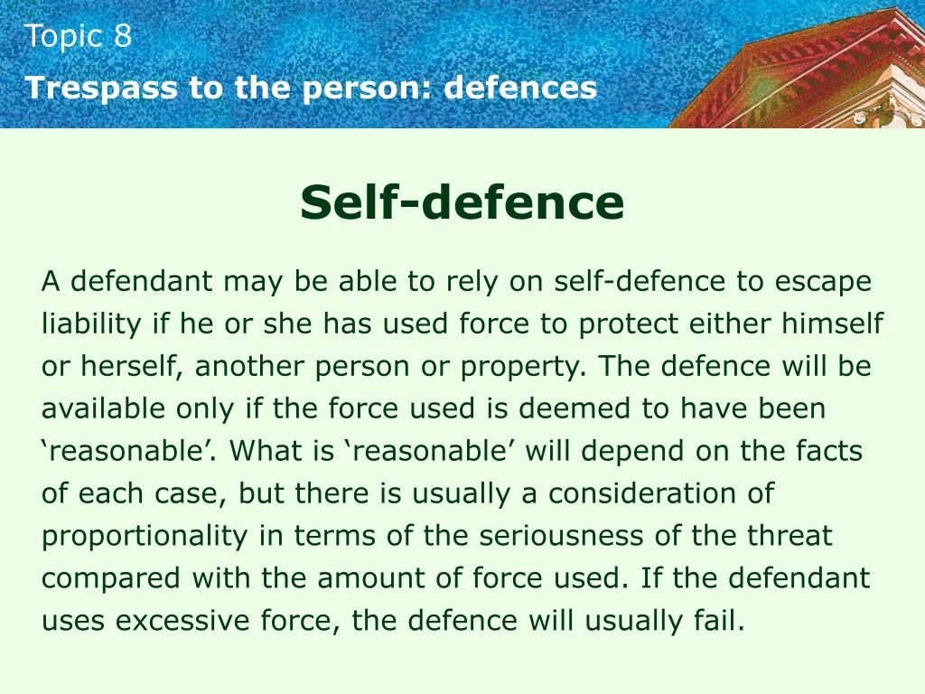Trespass to the person: defences Self-defence A defendant may be able to rely on self-defence to escape liability if he or she has used force to protect either himself or herself, another person or property. The defence will be available only if the force used is deemed to have been ‘reasonable’. What is ‘reasonable’ will depend on the facts of each case, but there is usually a consideration of proportionality in terms of the seriousness of the threat compared with the amount of force used. If the defendant uses excessive force, the defence will usually fail.