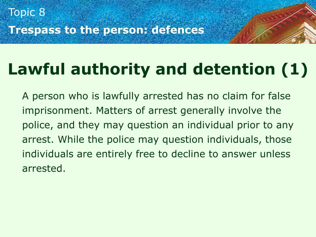 Trespass to the person: defences Lawful authority and detention (1) A person who is lawfully arrested has no claim for false imprisonment. Matters of arrest generally involve the police, and they may question an individual prior to any arrest. While the police may question individuals, those individuals are entirely free to decline to answer unless arrested.