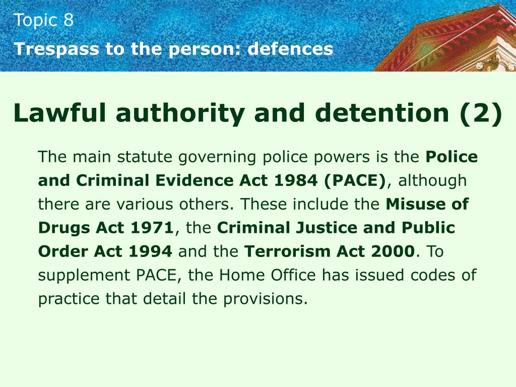 Trespass to the person: defences Lawful authority and detention (2) The main statute governing police powers is the Police and Criminal Evidence Act 1984 (PACE), although there are various others. These include the Misuse of Drugs Act 1971, the Criminal Justice and Public Order Act 1994 and the Terrorism Act 2000. To supplement PACE, the Home Office has issued codes of practice that detail the provisions.