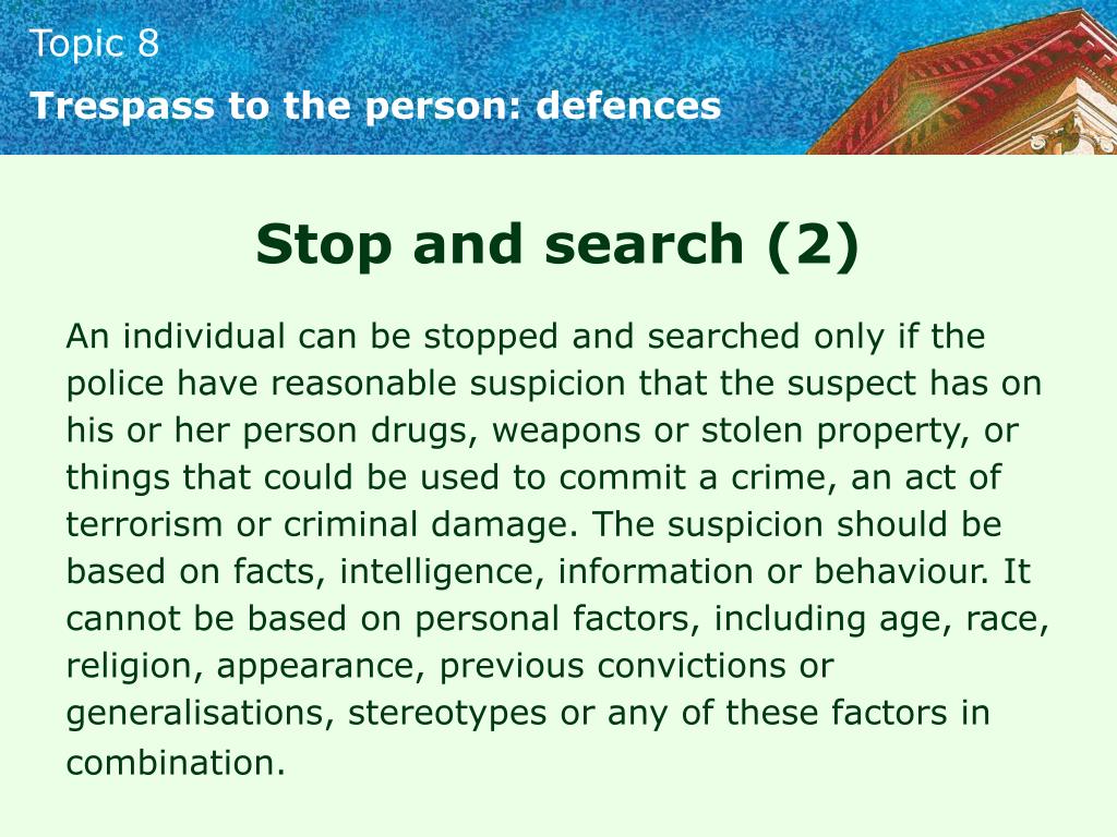 Trespass to the person: defences Stop and search (2) An individual can be stopped and searched only if the police have reasonable suspicion that the suspect has on his or her person drugs, weapons or stolen property, or things that could be used to commit a crime, an act of terrorism or criminal damage. The suspicion should be based on facts, intelligence, information or behaviour. It cannot be based on personal factors, including age, race, religion, appearance, previous convictions or generalisations, stereotypes or any of these factors in combination.