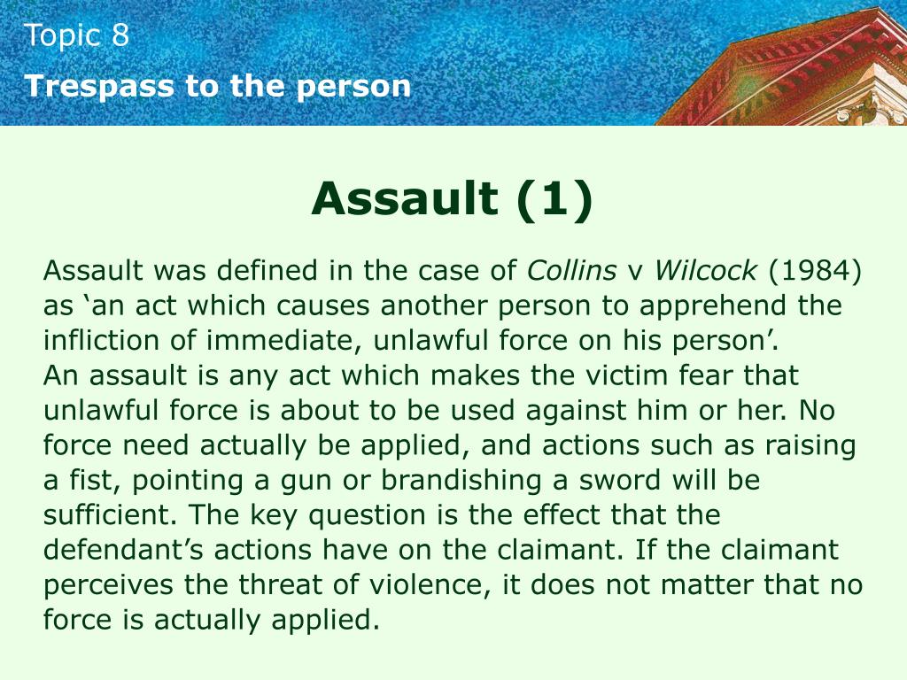 Trespass to the person Assault (1) Assault was defined in the case of Collins v Wilcock (1984) as ‘an act which causes another person to apprehend the infliction of immediate, unlawful force on his person’. An assault is any act which makes the victim fear that unlawful force is about to be used against him or her. No force need actually be applied, and actions such as raising a fist, pointing a gun or brandishing a sword will be sufficient. The key question is the effect that the defendant’s actions have on the claimant. If the claimant perceives the threat of violence, it does not matter that no force is actually applied.