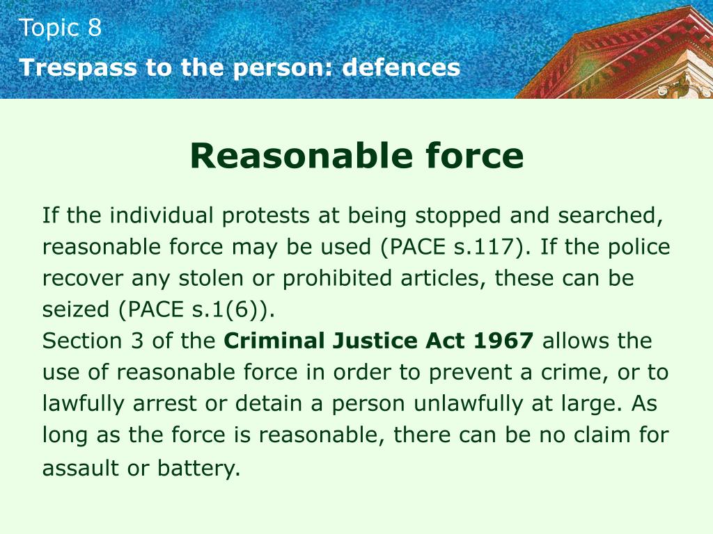 Trespass to the person: defences Reasonable force If the individual protests at being stopped and searched, reasonable force may be used (PACE s.117). If the police recover any stolen or prohibited articles, these can be seized (PACE s.1(6)). Section 3 of the Criminal Justice Act 1967 allows the use of reasonable force in order to prevent a crime, or to lawfully arrest or detain a person unlawfully at large. As long as the force is reasonable, there can be no claim for assault or battery.