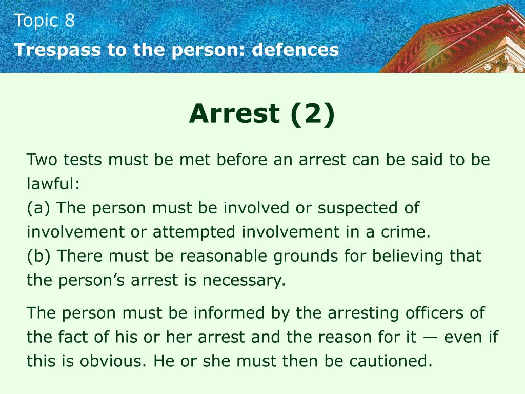 Trespass to the person: defences Arrest (2) Two tests must be met before an arrest can be said to be lawful: (a) The person must be involved or suspected of involvement or attempted involvement in a crime. (b) There must be reasonable grounds for believing that the person’s arrest is necessary. The person must be informed by the arresting officers of the fact of his or her arrest and the reason for it — even if this is obvious. He or she must then be cautioned.