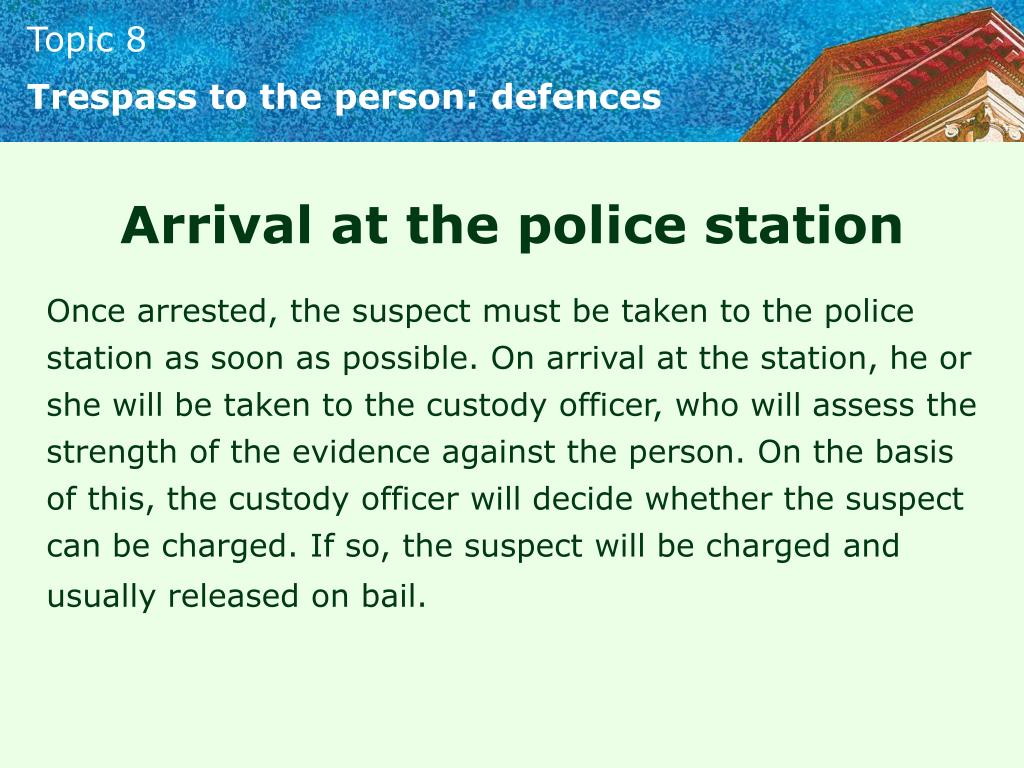 Trespass to the person: defences Arrival at the police station Once arrested, the suspect must be taken to the police station as soon as possible. On arrival at the station, he or she will be taken to the custody officer, who will assess the strength of the evidence against the person. On the basis of this, the custody officer will decide whether the suspect can be charged. If so, the suspect will be charged and usually released on bail.