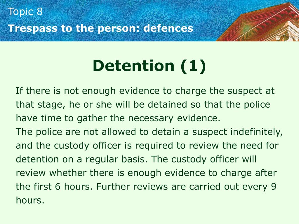 Trespass to the person: defences Detention (1) If there is not enough evidence to charge the suspect at that stage, he or she will be detained so that the police have time to gather the necessary evidence. The police are not allowed to detain a suspect indefinitely, and the custody officer is required to review the need for detention on a regular basis. The custody officer will review whether there is enough evidence to charge after the first 6 hours. Further reviews are carried out every 9 hours.