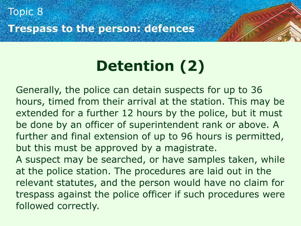 Trespass to the person: defences Detention (2) Generally, the police can detain suspects for up to 36 hours, timed from their arrival at the station. This may be extended for a further 12 hours by the police, but it must be done by an officer of superintendent rank or above. A further and final extension of up to 96 hours is permitted, but this must be approved by a magistrate. A suspect may be searched, or have samples taken, while at the police station. The procedures are laid out in the relevant statutes, and the person would have no claim for trespass against the police officer if such procedures were followed correctly.