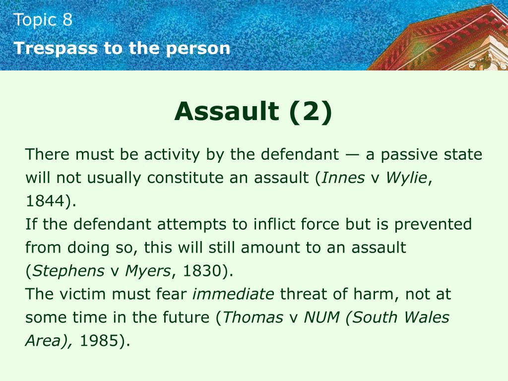 Trespass to the person Assault (2) There must be activity by the defendant — a passive state will not usually constitute an assault (Innes v Wylie, 1844). If the defendant attempts to inflict force but is prevented from doing so, this will still amount to an assault (Stephens v Myers, 1830). The victim must fear immediate threat of harm, not at some time in the future (Thomas v NUM(South Wales Area), 1985).