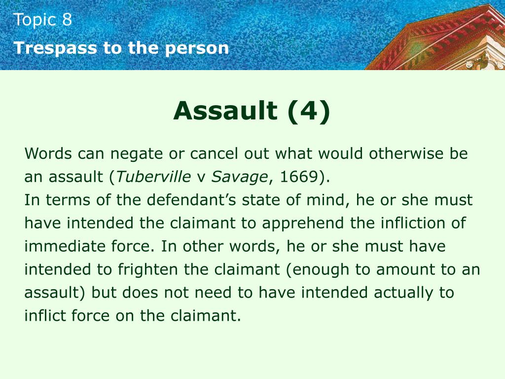 Trespass to the person Assault (4) Words can negate or cancel out what would otherwise be an assault (Tuberville v Savage, 1669). In terms of the defendant’s state of mind, he or she must have intended the claimant to apprehend the infliction of immediate force. In other words, he or she must have intended to frighten the claimant (enough to amount to an assault) but does not need to have intended actually to inflict force on the claimant.