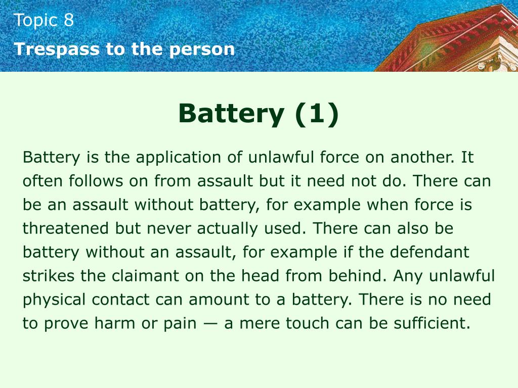Trespass to the person Battery (1) Battery is the application of unlawful force on another. It often follows on from assault but it need not do. There can be an assault without battery, for example when force is threatened but never actually used. There can also be battery without an assault, for example if the defendant strikes the claimant on the head from behind. Any unlawful physical contact can amount to a battery. There is no need to prove harm or pain — a mere touch can be sufficient.