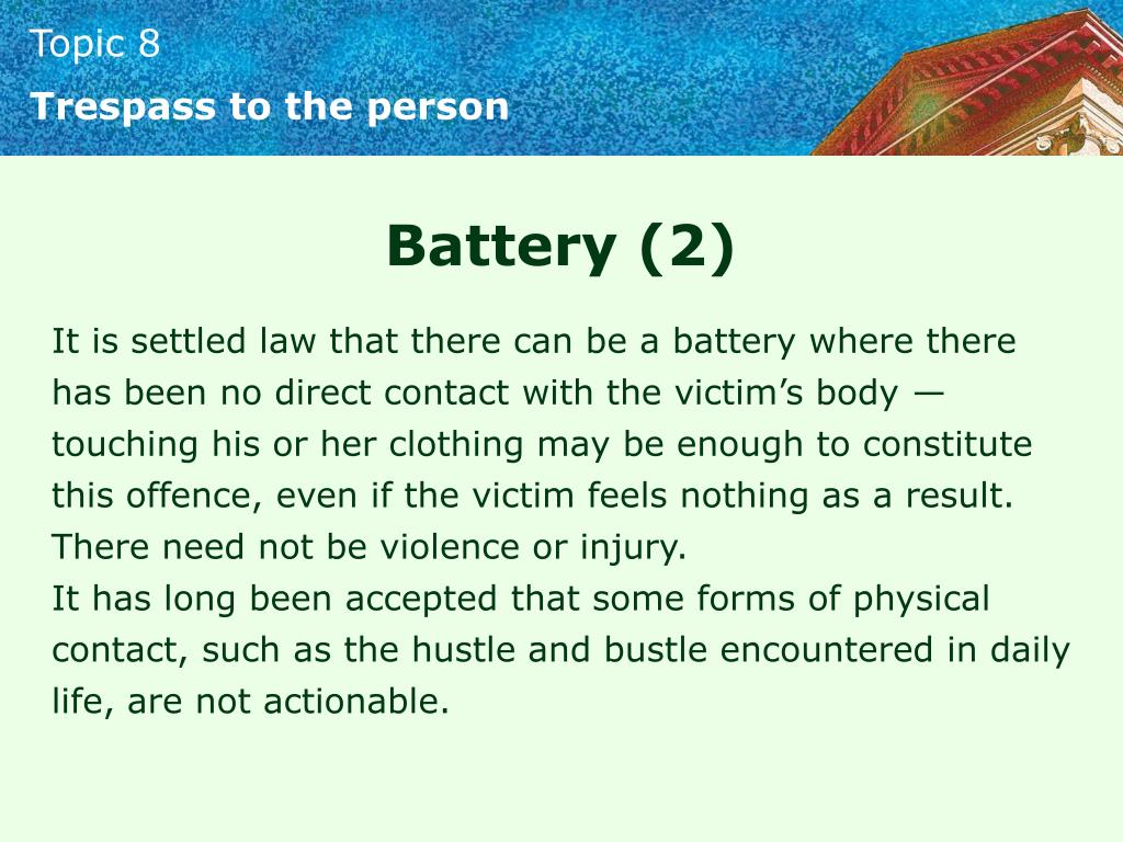 Trespass to the person Battery (2) It is settled law that there can be a battery where there has been no direct contact with the victim’s body — touching his or her clothing may be enough to constitute this offence, even if the victim feels nothing as a result. There need not be violence or injury. It has long been accepted that some forms of physical contact, such as the hustle and bustle encountered in daily life, are not actionable.