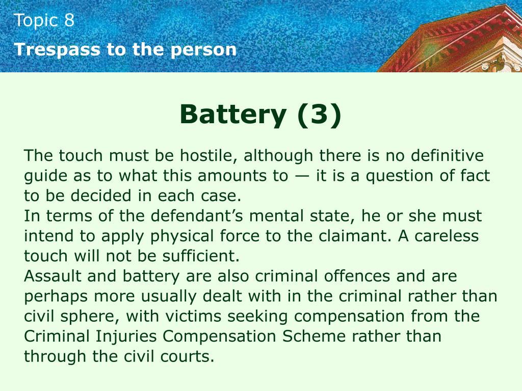 Trespass to the person Battery (3) The touch must be hostile, although there is no definitive guide as to what this amounts to — it is a question of fact to be decided in each case. In terms of the defendant’s mental state, he or she must intend to apply physical force to the claimant. A careless touch will not be sufficient. Assault and battery are also criminal offences and are perhaps more usually dealt with in the criminal rather than civil sphere, with victims seeking compensation from the Criminal Injuries Compensation Scheme rather than through the civil courts.