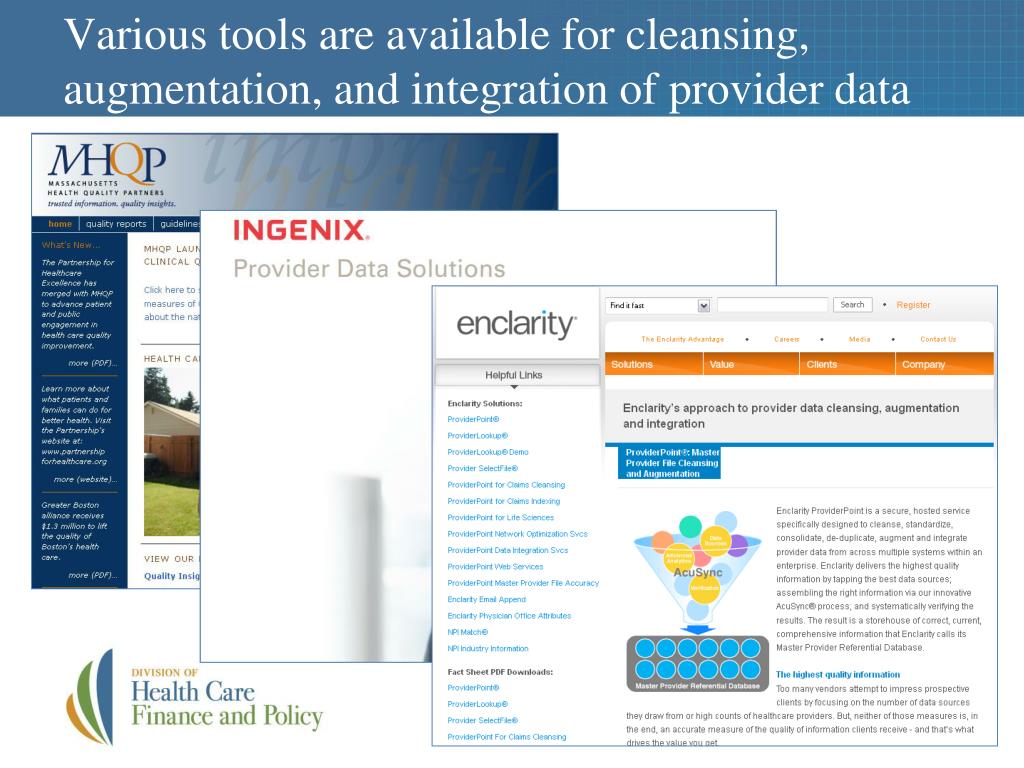 Various tools are available for cleansing, augmentation, and integration of provider data