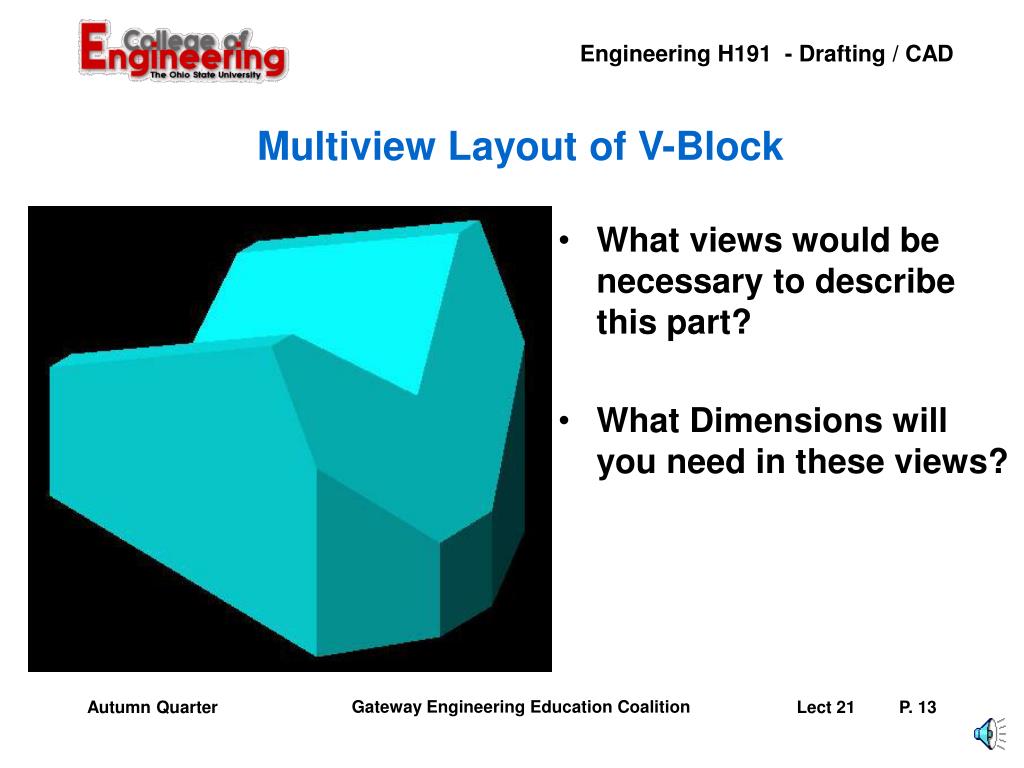What views would be necessary to describe this part? What Dimensions will you need in these views? Multiview Layout of V-Block Autumn Quarter