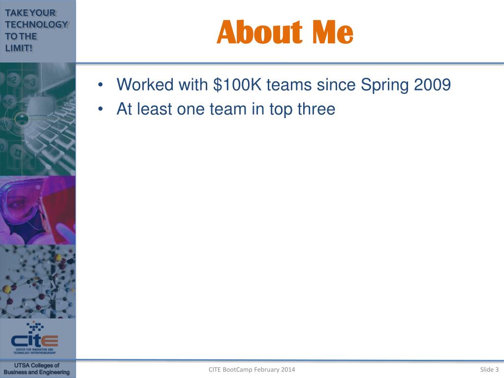 About Me • Worked with $100K teams since Spring 2009 • At least one team in top three CITE BootCamp February 2014