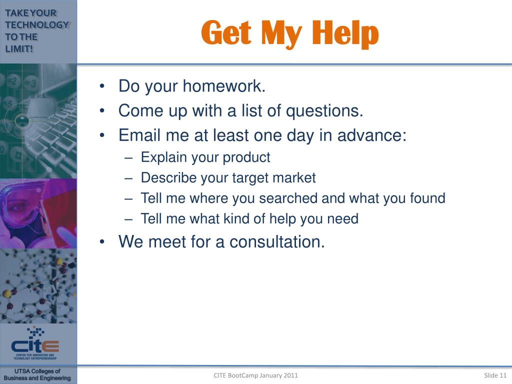 Get My Help • Do your homework. • Come up with a list of questions. • Email me at least one day in advance: • Explain your product • Describe your target market • Tell me where you searched and what you found • Tell me what kind of help you need • We meet for a consultation. CITE BootCamp January 2011