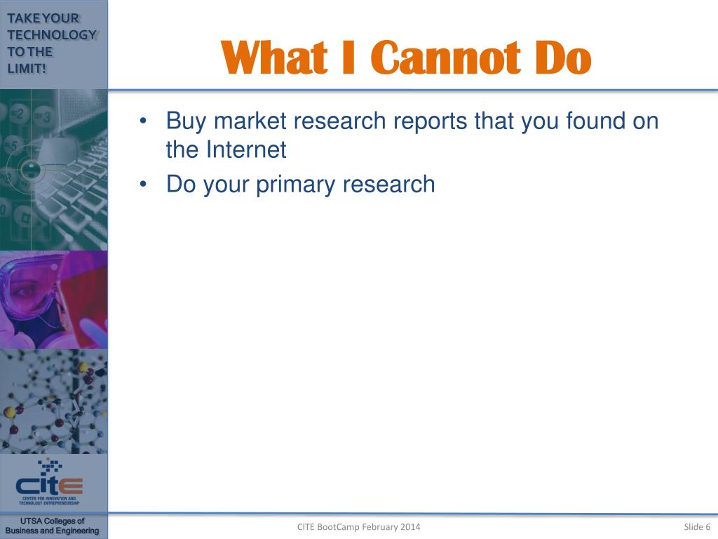 What I Cannot Do • Buy market research reports that you found on the Internet • Do your primary research CITE BootCamp February 2014