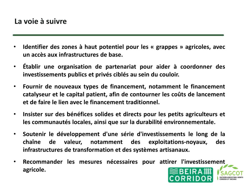 La voie à suivre • Identifier des zones à haut potentiel pour les « grappes » agricoles, avec un accès aux infrastructures de base. • Établir une organisation de partenariat pour aider à coordonner des investissements publics et privés ciblés au sein du couloir. • Fournir de nouveaux types de financement, notamment le financement catalyseur et le capital patient, afin de contourner les coûts de lancement et de faire le lien avec le financement traditionnel. • Insister sur des bénéfices solides et directs pour les petits agriculteurs et les communautés locales, ainsi que sur la durabilité environnementale. • Soutenir le développement d'une série d'investissements le long de la chaîne de valeur, notamment des exploitations-noyaux, des infrastructures de transformation et des systèmes artisanaux. • Recommander les mesures nécessaires pour attirer l'investissement agricole.