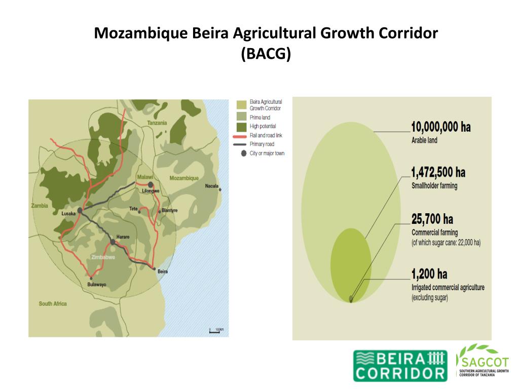 Principaux avantages pour les agriculteurs et les communautés locales Exemple : 190 000 hectares d'agriculture commerciale irriguée dans le couloir de Beira, au Mozambique permettent d'obtenir : 350 000 emplois, 1 milliard de revenus agricoles par an, l'électricité et l'eau dans 150 villages, l'accès abordable à des services d'irrigation pour 13 000 petits agriculteurs, l'amélioration de l'accès aux intrants et des financements et des marchés pour jusqu'à 200 000 ménages de petits exploitants. Les avantages majeurs pour les communautés environnantes, dans un rayon de 25 km des noyaux et grappes agricoles, incluent : l'accès aux intrants et aux marchés pour les petits agriculteurs la fourniture de services d'extension et financiers liens avec des chaînes de valeur agricoles spécifiques opportunités d'emploi sur la chaîne de valeur agricole