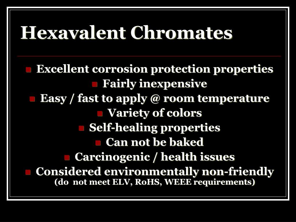 Hexavalent Chromates • Excellent corrosion protection properties • Fairly inexpensive • Easy / fast to apply @ room temperature • Variety of colors • Self-healing properties • Can not be baked • Carcinogenic / health issues • Considered environmentally non-friendly (do not meet ELV, RoHS, WEEE requirements)